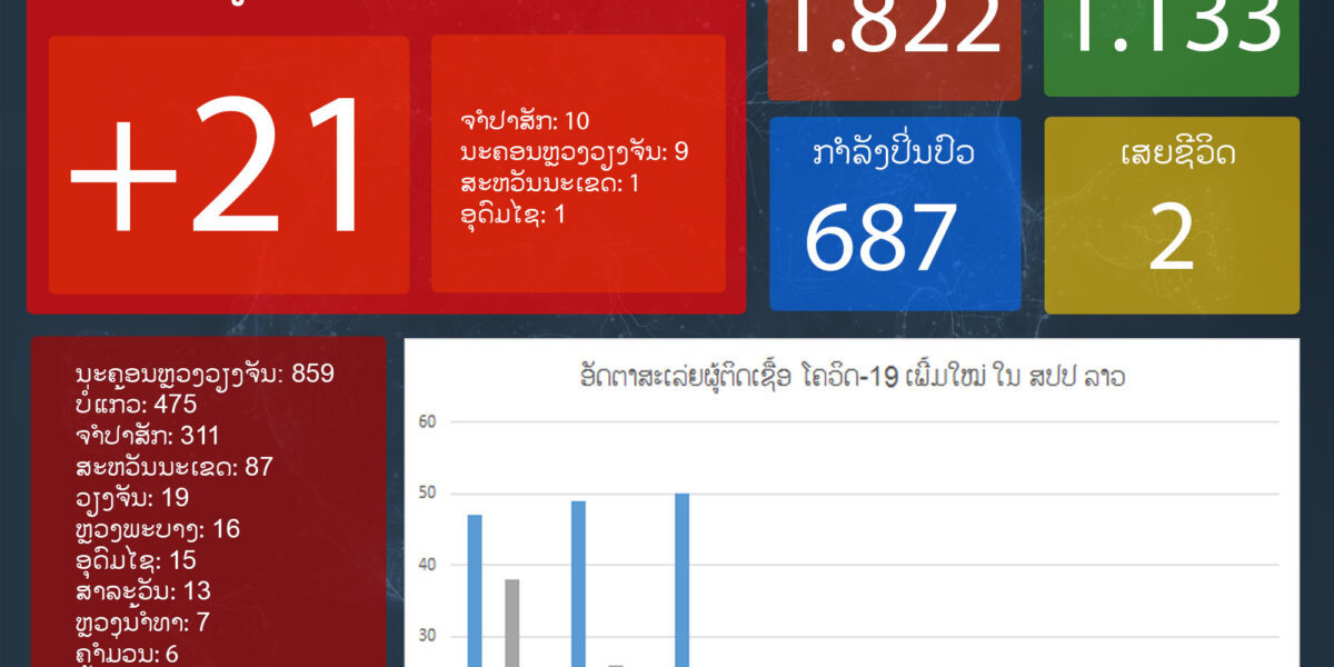 ຮອດປັດຈຸບັນນີ້ ສປປ ລາວມີຜູ້ຕິດເຊື້ອສະສົມຈາກພະຍາດໂຄວິດ-19 ແລ້ວຈໍານວນ 1.822 ຄົນໃນນີ້ປິ່ນປົວຫາຍດີ 1.133 ຄົນ, ຍັງນອນປິ່ນປົວຢູ່ໂຮງໝໍໃນຂອບເຂດທົ່ວປະເທດຈຳ ນວນ 687 ຄົນ ແລະ ເສຍຊີວິດ 2 ຄົນ.