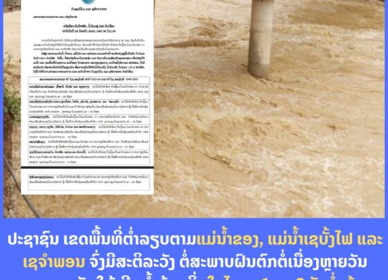 ສະພາບລະດັບນໍ້າ ນໍ້າຂອງ, ເຊບັ້ງໄຟ ແລະ ເຊຈຳພອນ ແມ່ນລະດັບນໍ້າ ຈະມີທ່າອ່ຽງສູງຂຶ້ນຕື່ມອີກ ໃນໄລຍະ 1 ຫາ 2 ວັນຕໍ່ໜ້າ, ດັ່ງນັ້ນ ຂໍໃຫ້ປະຊາຊົນ ທີ່ອາໄສຢູ່ໃກ້ແມ່ນໍ້າ ແລະ ເຂດພື້ນທີ່ຕໍ່າລຽບຕາມ ແມ່ນໍ້າຂອງ ໂດຍສະເພາະ ແຂວງຫຼວງພະບາງ,…