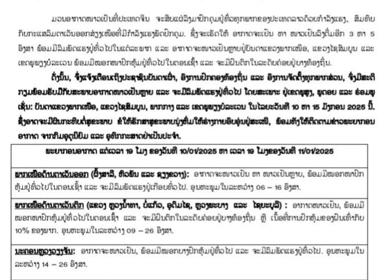 ໃນໄລຍະແຕ່ວັນທີ 10-15 ມັງກອນ 2025, ອາກາດຈະເຢັນລົງອີກ 3-5 ອົງສາ ພ້ອມມີລົມພັດແຮງຢູ່ທົ່ວໄປໃນແຕ່ລະພາກ