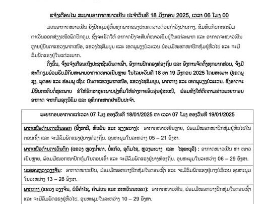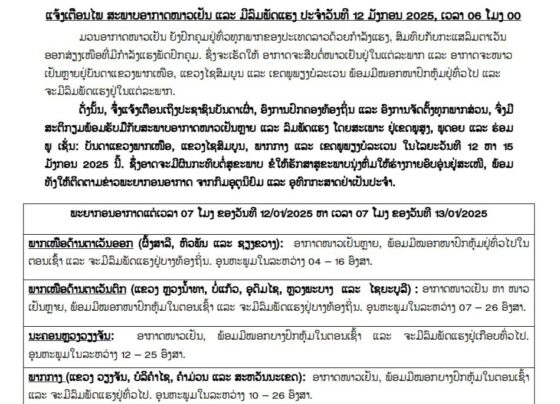 ອາກາດຈະໜາວເຢັນຫຼາຍ ໃນໄລຍະວັນທີ 12 ຫາ 15 ມັງກອນ 2025 ນີ້