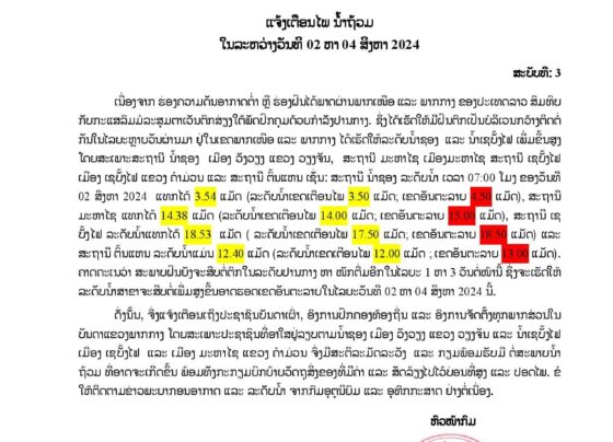 ແຈ້ງເຕືອນ! ປະຊາຊົນທີ່ອາໄສຢູ່ແຄມນໍ້າເຊບັ້ງໄຟ ແລະ ນໍ້າຊອງລະວັງນໍ້າຖ້ວມ