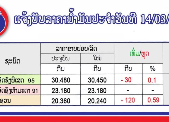 ກະຊວງອຸດສາຫະກຳ ແລະ ການຄ້າໄດ້ປັບລົງລາຄານ້ຳມັນແອັດຊັງພິເສດ ແລະ ກາຊວນ, ສ່ວນລາຄານ້ຳມັນແອັດຊັງທໍາມະດາ ຍັງລາຄາເກົ່າ, ເລີ່ມປະຕິບັດ ມື້ອື່ນ ນັບແຕ່ເວລາ 06:00 ໂມງ.
