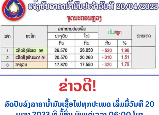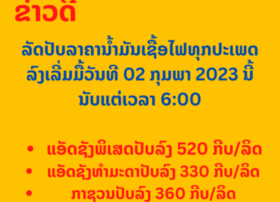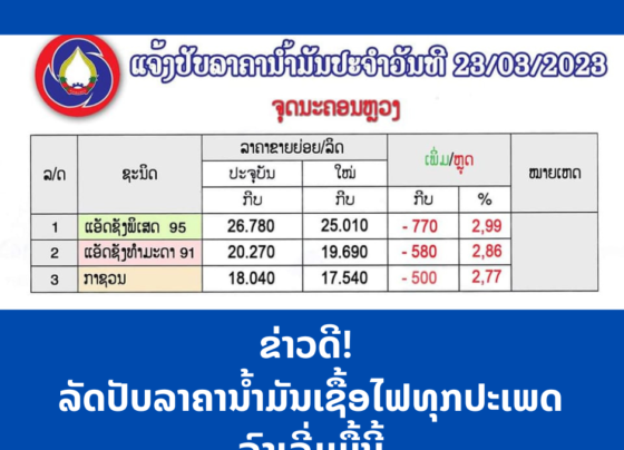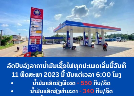 ລັດປັບລາຄານໍ້າມັນເຊື້ອໄຟທຸກປະເພດລົງຫຼາຍກວ່າ 500 ກີບ/ລິດ