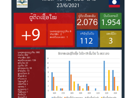 ຄະນະສະເພາະກິດປ້ອງກັນ, ຄວບຄຸມ ແລະ ແກ້ໄຂການແຜ່ລະບາດຂອງພະຍາດໂຄວິດ-19 ແຈ້ງໃຫ້ຮູ້ໃນວັນທີ 23 ມິຖຸນາ 2021ນີ້ວ່າ: ມື້ນີ້ລາວກວດພົບຜູ້ຕິດເຊື້ອພະຍາດໂຄວິດ-19 ເພີ່ມໃໝ່ຈໍານວນ 9 ຄົນໃນຂອບເຂດທົ່ວປະເທດ ຈາກຜູ້ເຂົ້າຮັບການກວດຫາເຊື້ອ 1.294 ຄົນ ເມື່ອວັນທີ 22 ມິຖຸນາ 2021 ທີ່ຜ່ານມາ,…
