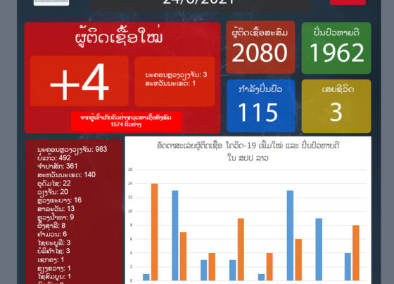 ຄະນະສະເພາະກິດປ້ອງກັນ, ຄວບຄຸມ ແລະ ແກ້ໄຂການແຜ່ລະບາດຂອງພະຍາດໂຄວິດ-19 ແຈ້ງໃຫ້ຮູ້ໃນວັນທີ 24 ມິຖຸນາ 2021ນີ້ວ່າ: ມື້ນີ້ລາວກວດພົບຜູ້ຕິດເຊື້ອພະຍາດໂຄວິດ-19 ເພີ່ມໃໝ່ຈໍານວນ 4 ຄົນໃນຂອບເຂດທົ່ວປະເທດ ຈາກຜູ້ເຂົ້າຮັບການກວດຫາເຊື້ອ 1.574 ຄົນ ເມື່ອວັນທີ 23 ມິຖຸນາ 2021 ທີ່ຜ່ານມາ,…