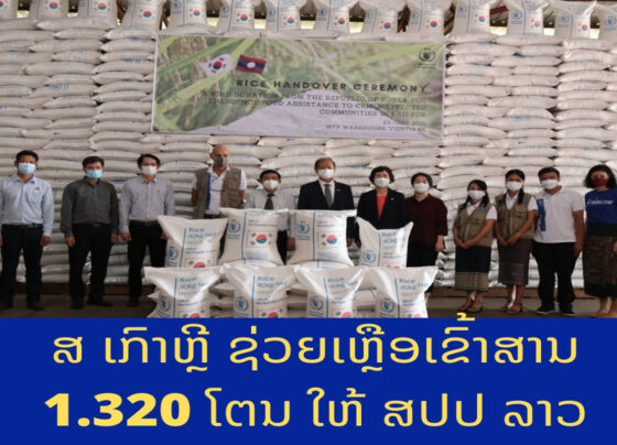 ລັດຖະບານ ແຫ່ງ ສາທາລະນະລັດ ເກົາຫຼີ ໄດ້ຊ່ວຍເຫຼືອເຂົ້າສານຈ້າວ ຈຳນວນ 1.320 ໂຕນ ໃຫ້ແກ່ລັດຖະບານລາວເພື່ອເປັນເຂົ້າສໍາຮອງລວມ ໃນຂັ້ນສູນກາງ ໄວ້ຊ່ວຍຜູ້ປະສົບໄພທຳມະຊາດໃນ ກໍລະນີ ທີ່ເກີດມີໄພພິບັດ ທີ່ບໍ່ທັນໄດ້ຄາດຄິດ ຊຶ່ງເຂົ້າດັ່ງກ່າວຈະຖືກນໍາໃຊ້ໂດຍອົງການອາຫານໂລກ ເພື່ອຮັບປະກັນວ່າເຂົ້າທີ່ມອບໃນຄັ້ງນີ້ຈະເປັນປະ ໂຫຍດ ໃຫ້ແກ່ປະຊາຊົນຜູ້ທີ່ຕ້ອງການຄວາມຊ່ວຍ ເຫຼືອຢ່າງແທ້ຈິງ…