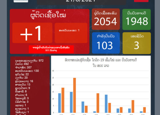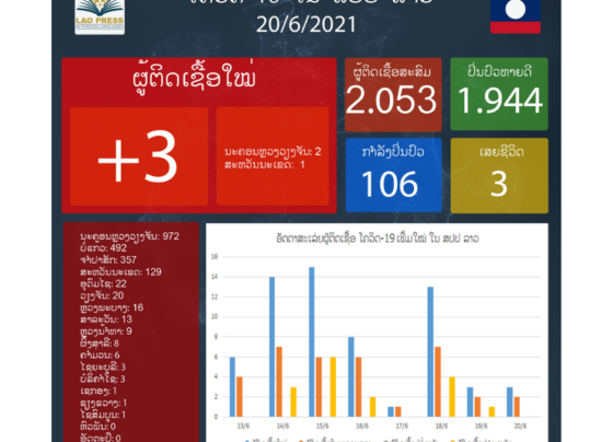 ຄະນະສະເພາະກິດປ້ອງກັນ, ຄວບຄຸມ ແລະ ແກ້ໄຂການແຜ່ລະບາດຂອງພະຍາດໂຄວິດ-19 ແຈ້ງໃຫ້ຮູ້ໃນວັນທີ 18 ມິຖຸນາ 2021ນີ້ວ່າ: ມື້ນີ້ລາວກວດພົບຜູ້ຕິດເຊື້ອພະຍາດໂຄວິດ-19 ເພີ່ມໃໝ່ຈໍານວນ 13 ຄົນໃນຂອບເຂດທົ່ວປະເທດ ຈາກຜູ້ເຂົ້າຮັບການກວດຫາເຊື້ອ 1.479 ຄົນ ເມື່ອວັນທີ 17 ມິຖຸນາ 2021 ທີ່ຜ່ານມາ, ຜູ້ຕິດເຊື້ອໃໝ່ດັ່ງກ່າວແມ່ນຢູ່ ນະຄອນຫຼວງວຽງຈັນ 7 ຄົນ…
