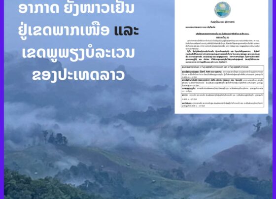 ກົມອຸຕຸນິຍົມ ແລະ ອຸທົກກະສາດ ແຈ້ງເຕືອນວ່າ: ສະພາບອາກາດ ຍັງຈະສືບຕໍ່ເຢັນ ຫາ ໜາວເຢັນໃນແຕ່ລະພາກ ແລະ ອາກາດຈະໜາວເຢັນຫຼາຍຢູ່ແຂວງພາກເໜືອ, ແຂວງໄຊສົມບູນ ແລະ ເຂດພູພຽງບໍລະເວນ ພ້ອມຈະມີລົມພັດແຮງຢູ່ບາງທ້ອງຖິ່ນ, ເນື່ອງຈາກ ມວນອາກາດໜາວເຢັນທີ່ປະເທດຈີນ ຍັງຈະສືບຕໍ່ແຜ່ລົງມາປົກຄຸມຢູ່ທົ່ວທຸກພາກຂອງປະເທດລາວ ດ້ວຍກໍາລັງປານກາງ ຫາ ແຮງ…