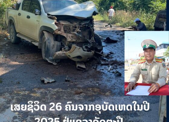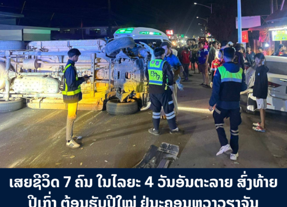 ໃນໄລຍະ 4 ວັນອັນຕະລາຍສົ່ງທ້າຍປີເກົ່າ 2025 ຕ້ອນຮັບປີໃໝ່ 2026 ຢູ່ນະຄອນຫຼວງວຽງຈັນ ມີຜູ້ເສຍຊີວິດ 7 ຄົນ, ມີຜູ້ບາດເຈັບໜັກ 3 ຄົນ, ລົດເປ່ເພເລັກນ້ອຍ 12 ຄັນ, ເປ່ເພສົມຄວນ 41 ຄັນ ແລະ…