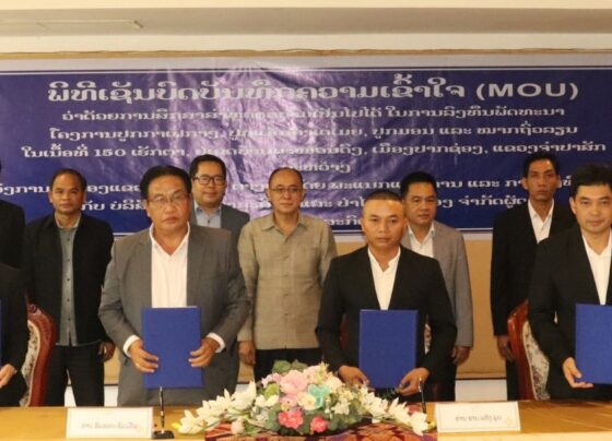 ບໍລິສັດ ພັດທະນາກະສິກຳ ແລະ ປ່າໄມ້ ປາກຊ່ອງ ຈຳກັດຜູ້ດຽວ ສົນໃຈລົງທຶນລົງທຶນພັດທະນາໂຄງການ ປູກກາເຟກາງ, ແມັກຄາເດເມຍ, ມອນ ແລະ ຖົ່ວລຽນ ໃນເນື້ອທີ່ 150 ເຮັກຕາ ຢູ່ເຂດບ້ານພະໜວນດົງ ເມືອງປາກຊ່ອງ. ພິທີເຊັນບົດບັນທຶກຄວາມເຂົ້າໃຈ ວ່າດ້ວຍການສຶກສາສຳຫຼວດຄວາມເປັນໄປໄດ້ ໃນການລົງທຶນ…