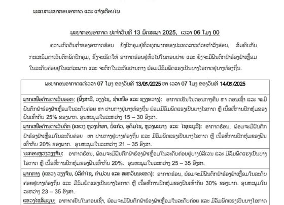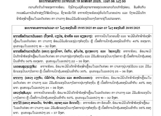 24 ຊົ່ວໂມງຕໍ່ໄປນີ້, ອາກາດຍັງຈະຮ້ອນຢູ່ທົ່ວໄປໃນຕອນບ່າຍ ແລະ ຍັງຈະມີຝົນຕົກ ຟ້າຮ້ອງ ຟ້າເຫຼີ້ອມໃນລະດັບຄ່ອຍ ຫາ ປານກາງ ພ້ອມມີລົມພັດແຮງເປັນບາງໂອກາດຢູ່ໃນແຕ່ລະພາກ ຍ້ອນຄວາມກົດດັນຕໍ່າຂອງອາກາດຮ້ອນ, ຍັງປົກຄຸມຢູ່ທົ່ວທຸກພາກຂອງ ປະເທດລາວ ດ້ວຍກໍາລັງອ່ອນ, ສົມທົບກັບກະແສລົມຕາເວັນຕົກສ່ຽງໃຕ້ ພັດປົກຄຸມ