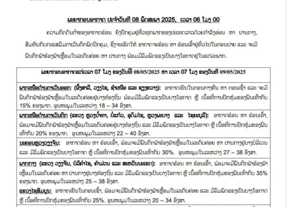 24 ຊົ່ວໂມງຕໍ່ໄປນີ້ ແຕ່ລະພາກ ອາກາດຮ້ອນ ແລະ ຈະມີຝົນຕົກຟ້າຮ້ອງຟ້າເຫຼື້ອມໃນລະດັບຄ່ອຍ ແລະ ຕົກໃນລະດັບປານກາງ ພ້ອມມີລົມພັດແຮງຢູ່ບາງທ້ອງຖິ່ນ ຢູ່ແຂວງພາກກາງ ລົງຫາ ພາກໃຕ້