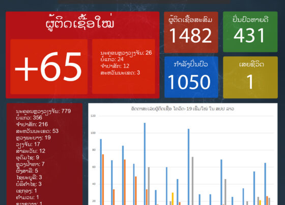 ມື້ນີ້ມີຜູ້ຕິດເຊື້ອພະຍາດໂຄວິດ-19 ເພີ່ມໃໝ່ 65 ຄົນ, ເພີ່ມຂຶ້ນ 10 ຄົນຖ້າທຽບໃສ່ມື້ວານນີ້